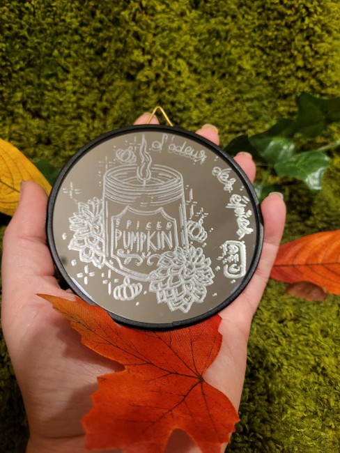 Ce miroir gravé capture la magie douce des soirées d'automne: une bougie "Pumpkin Spice"