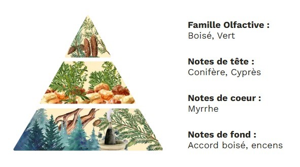 - Notes de Tête: conifère et cyprès, fraîches et résineuses, pour un départ vivifiant