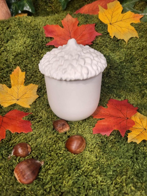 "Balade en Forêt", logée dans un élégant contenant en jesmonite en forme de gland.