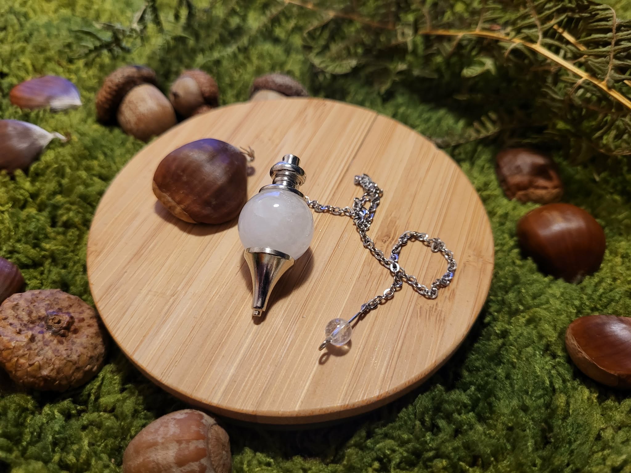Ce pendule en Cristal de Roche, taillé en sphère, est la pierre de la clarté, de la pureté énergétique et de l'amplification des intentions. Il recentre l'esprit, harmonise les vibrations et renforce toutes les énergies avec lesquelles il est associé.