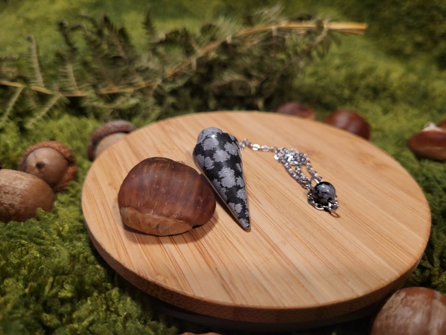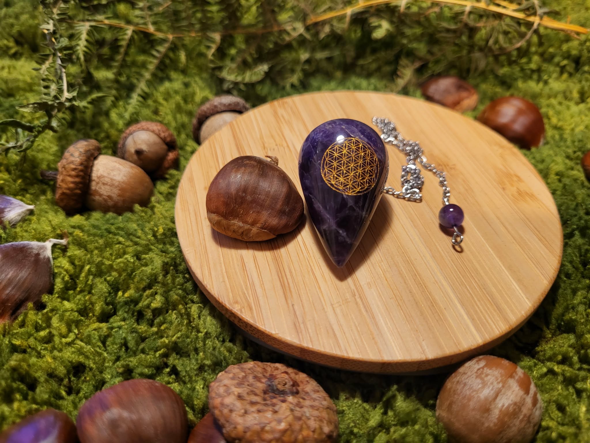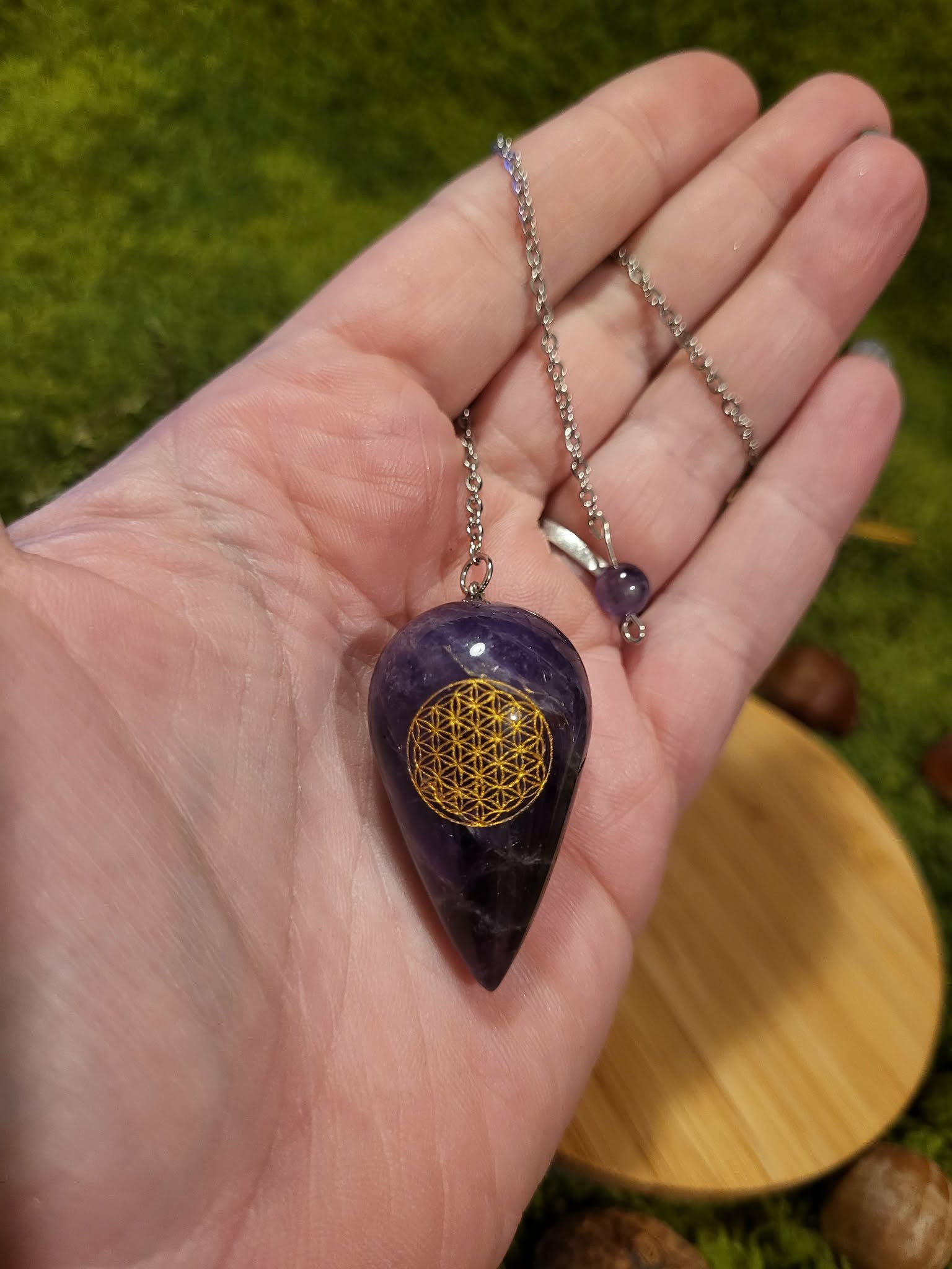 Ce pendule en Améthyste, taillé en Goutte, gravé d'une fleur de vie dorée, allie la sagesse spirituelle à la géométrie sacrée. Il apaise l'esprit, protège des énergiesn négatives et élève l'intuition lors des séances de radiesthésie.
