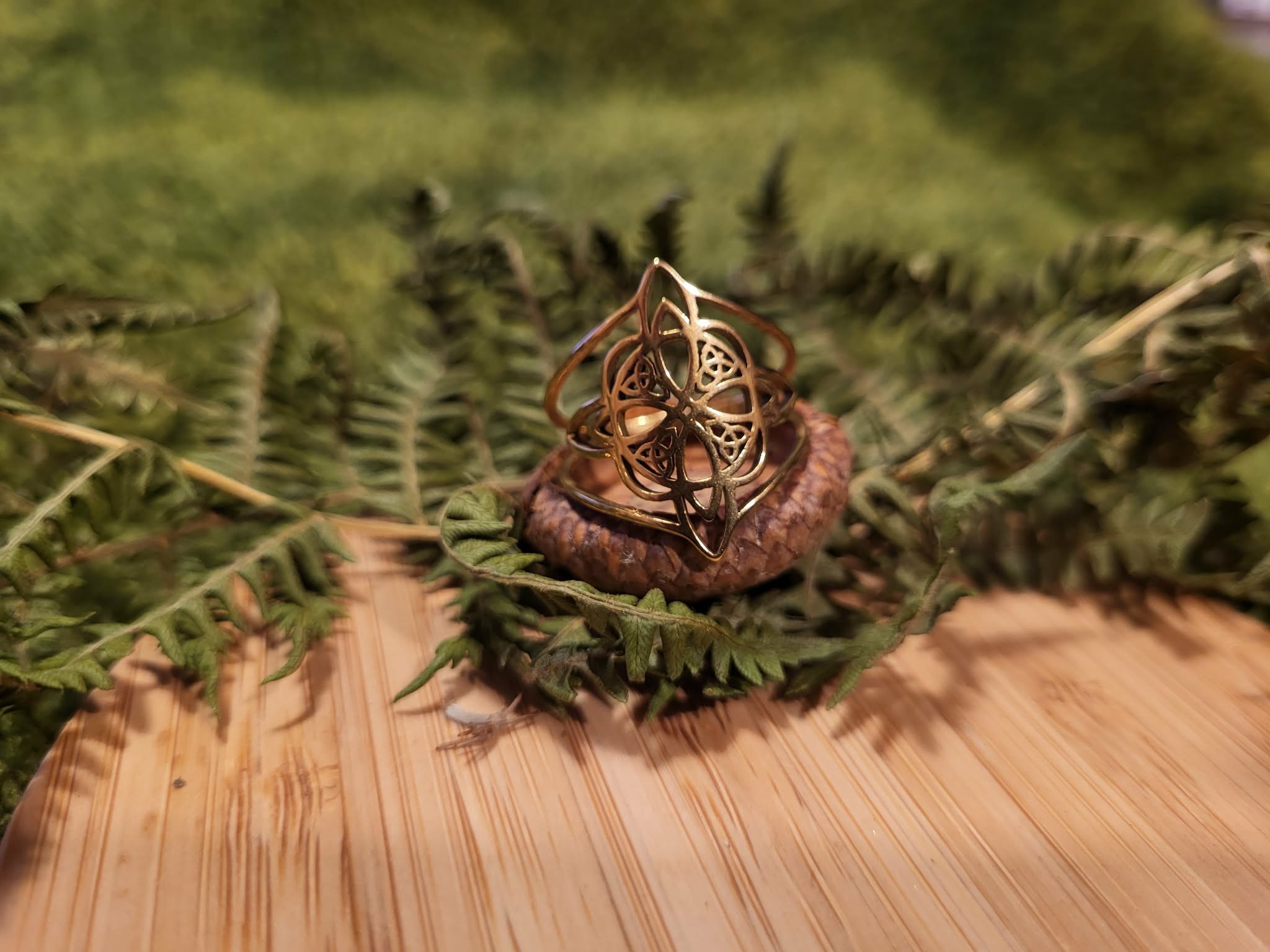 Cette bague en acier inoxydable doré représente le Noeud de Sorcière, symbole de Protection,
